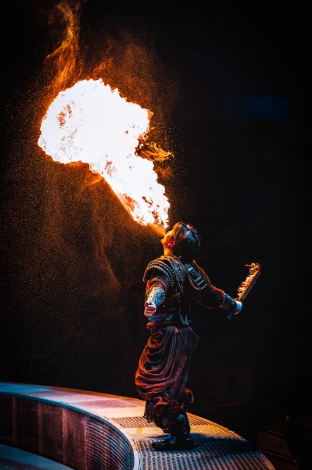 “本次升級,我們采用“天幕地屏+激光投影”的立體舞臺設(shè)計,打破了傳統(tǒng)演出的空間限制,給觀眾帶來前所未有的沉浸式體驗?!睂?dǎo)演閔銳接受采訪時說,“《王的戰(zhàn)車》以北方部落的古老傳說為藍本,將傳統(tǒng)技藝與現(xiàn)代科技巧妙融合。比如縵吊演員的表演象征著部落信仰的升華,而噴火表演則象征著勇士的熾熱斗志。整場演出既保留了傳統(tǒng)雜技的力量與驚險,又通過全息投影技術(shù)等科技手段賦予其全新的藝術(shù)表達,希望觀眾在觀演的過程中,除了感受到震撼,也能體會到中國傳統(tǒng)文化的深厚底蘊與傳承。