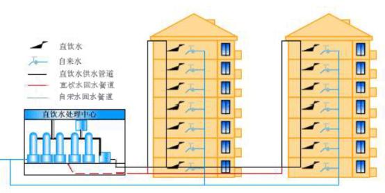 管道直飲水也稱分質(zhì)供水,興建于20世紀(jì)90年代中期,主要分布在人口較為集中的學(xué)校、醫(yī)院、商務(wù)樓宇、較高檔的小區(qū)。分質(zhì)供水是以自來水為原水,把自來水中生活用水和直接飲水區(qū)分開,另設(shè)管道直通住戶,實(shí)現(xiàn)飲用水和生活用水分質(zhì)、分流,達(dá)到直飲的目的。管道直飲水通過中央凈水設(shè)備在自來水提供的原水基礎(chǔ)上經(jīng)過再凈化過程提供給人們飲用,通過一些物理過濾、消毒殺菌等深度處理技術(shù)對(duì)自來水進(jìn)行進(jìn)一步處理,去除水中的有機(jī)物、重金屬、細(xì)菌、病毒等有害物質(zhì),滿足優(yōu)質(zhì)優(yōu)用、低質(zhì)低用的要求。