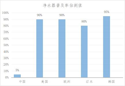 中國市場凈水器普及率相比歐美發(fā)達(dá)國家較低,凈水器普及率僅約占5%,同時(shí)市場總規(guī)模也較其他廚衛(wèi)電器較小。