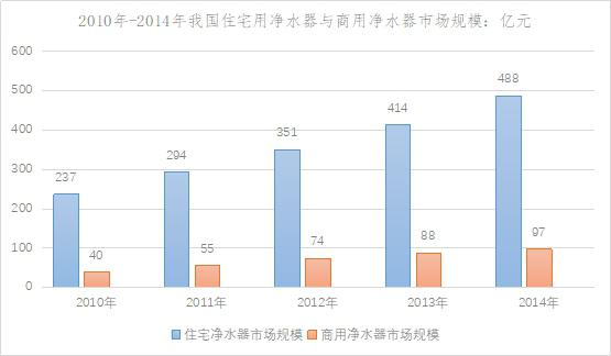 中國凈水器應(yīng)用市場主要是居民及商業(yè)凈水器市場。2014年國內(nèi)商用凈水器市場達(dá)到97億元,居民住宅凈水器市場規(guī)模達(dá)到488億元,同時(shí)住宅凈水器市場占比明顯大于商用凈水器市場。