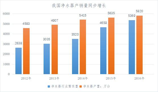 2012 年以來,我國凈水器的產(chǎn)銷量逐年增長,市場需求不斷擴(kuò)大。2016 年,凈水器產(chǎn)量達(dá)到 1,347.8 萬臺(tái),銷量為 1,353.4 萬臺(tái)。從 2014 年開始,凈水器產(chǎn)銷量增速雙雙放緩,市場進(jìn)入調(diào)整期。相對(duì)于整個(gè)家電行業(yè)而言,凈水器市場仍然維持著較高增速,市場潛力較大,競爭激烈。