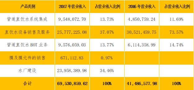 公司的主營業(yè)務(wù)為管道直飲水系統(tǒng)BOT業(yè)務(wù)、管道直飲水系統(tǒng)集成、直飲水設(shè)備的生產(chǎn)、銷售及服務(wù),其收入按產(chǎn)品類別列示如下: