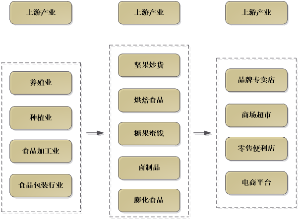 休閑食品行業(yè)的上游行業(yè)包括傳統(tǒng)農(nóng)業(yè)如種植業(yè)、養(yǎng)殖業(yè)、,食品添加劑、食品包裝行業(yè)。行業(yè)的下游主要是銷售環(huán)節(jié),通過多種渠道如大型商超、直營(yíng)店、經(jīng)銷商等進(jìn)行銷售,直面產(chǎn)品終端消費(fèi)者。