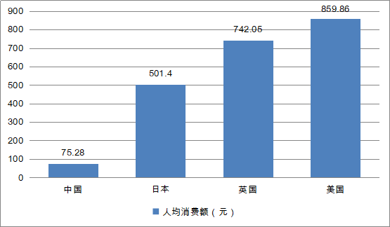 從消費(fèi)額來看,中國(guó)休閑食品人均消費(fèi)額為75.28元,而日本、英國(guó)、美國(guó)的該數(shù)額分別是501.4元,742.05元和859.86元,差距較大。
