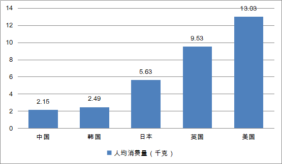 橫向?qū)Ρ任覈?guó)與世界其他發(fā)達(dá)國(guó)家休閑食品人均消費(fèi)額、消費(fèi)量可以發(fā)現(xiàn),盡管近年來中國(guó)休閑食品市場(chǎng)增長(zhǎng)較快,但與發(fā)達(dá)國(guó)家相比仍有不小的差距,增長(zhǎng)空間較大。目前,我國(guó)休閑食品人均消費(fèi)量為2.15千克,較為接近韓國(guó)的2.49千克,但與日本(5.63千克)、英國(guó)(9.53千克)、美國(guó)(13.03千克)相比差距仍較大。