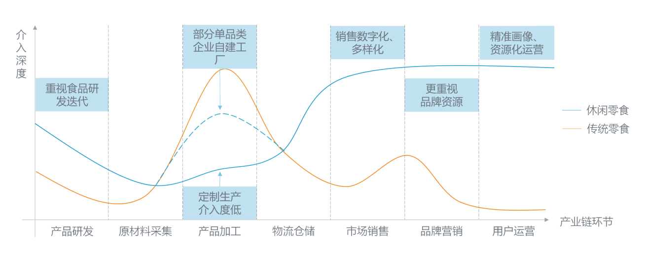 目前,市場(chǎng)上對(duì)休閑零食的劃分有五至十二個(gè)品類,每個(gè)品類之中又包含若干子品類,導(dǎo)致休閑零食的市場(chǎng)碎片化嚴(yán)重;傳統(tǒng)食品企業(yè)跨品類經(jīng)營(yíng)意味著重新購置、配置一條生產(chǎn)線,成本巨大;同時(shí),部分休閑零食企業(yè)采用對(duì)外合作定制生產(chǎn)策略,僅發(fā)力于食品研發(fā)環(huán)節(jié),一定程度上改進(jìn)了以往重資產(chǎn)企業(yè)跨品類難度大的問題,孕生了平臺(tái)型、多品類經(jīng)營(yíng)新業(yè)態(tài)。