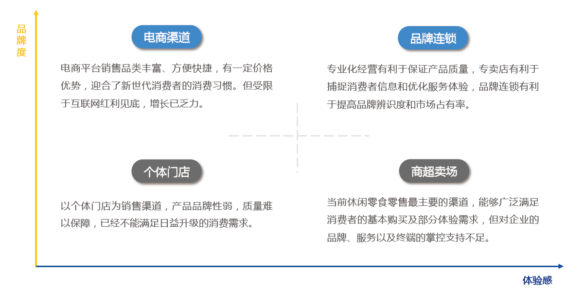 休閑零食的渠道陣營(yíng)主要有四大類:傳統(tǒng)的個(gè)體門店和商超賣場(chǎng),新興的品牌連鎖和電商渠道。在新零售浪潮的沖擊下,四大陣營(yíng)此消彼長(zhǎng),個(gè)體門店的市場(chǎng)份額不斷縮減,商超賣場(chǎng)的渠道影響力也將減弱,品牌連鎖和電商渠道將成為未來休閑零食新消費(fèi)的主流渠道。
