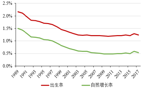 另一方面,中國近年來的人口出生率和自然增長率也呈現(xiàn)不斷下降的趨勢(shì),2017年比2016年出生人口減少了63萬人,人口出生率僅為12.4‰,同比降低0.5‰,這一數(shù)據(jù)比日本的出生率還要低。我國的人口自然增長率更是下降到5.3‰,長期的低生育水平直接加大了對(duì)未來我國勞動(dòng)力不足的擔(dān)憂。