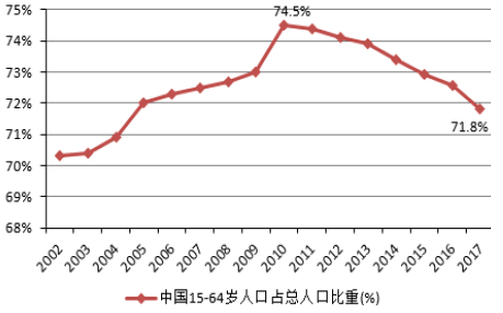 近年來,中國人口結(jié)構(gòu)發(fā)生了巨大變化,15-64歲勞動(dòng)適齡人口占總?cè)丝诘谋戎刈?011年以來呈現(xiàn)逐步下滑的趨勢(shì),2017年該比重已經(jīng)下滑至71.8%,相比2010年的最高點(diǎn)降低了2.7個(gè)百分點(diǎn)。另外,中國社會(huì)的老齡化問題更加嚴(yán)重,中國人口紅利逐步消失,目前已經(jīng)出現(xiàn)了劉易斯拐點(diǎn)。人口結(jié)構(gòu)的變化,勞動(dòng)力供給條件的變化顯著的推高了我國的勞動(dòng)成本,不僅削弱了制造業(yè)的競爭力,對(duì)勞動(dòng)密集型的產(chǎn)業(yè)同樣也帶來了嚴(yán)峻的挑戰(zhàn),也削弱了中國產(chǎn)品在全球市場的競爭力。