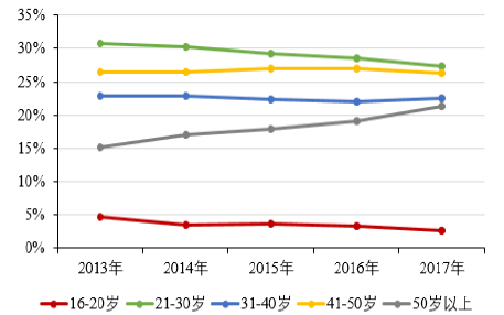 農(nóng)民工是我國城鎮(zhèn)化進(jìn)程中的勞動(dòng)力主力軍,然而近年來,農(nóng)民工群體也呈現(xiàn)出逐步老齡化的特征,農(nóng)民工平均年齡不斷提高,50歲以上農(nóng)民工所占比重提高較快。2017年農(nóng)民工平均年齡為39.7歲,比16年提高0.7歲。從年齡結(jié)構(gòu)看,30歲以下的年青一代農(nóng)民工所占比重為29.9%,比16年下降2.0個(gè)百分點(diǎn);40歲及以下農(nóng)民工所占比重為52.4%,比16年下降1.5個(gè)百分點(diǎn);50歲以上農(nóng)民工所占比重為21.3%,比16年提高2.2個(gè)百分點(diǎn),自2014年以來比重提高呈加快態(tài)勢(shì)。農(nóng)民工老齡化逐年加劇,直接影響了社會(huì)勞動(dòng)力的供給,機(jī)器替代人工成為解決這一問題最為有效的方式,也是我國制造業(yè)轉(zhuǎn)型升級(jí)的必經(jīng)之路。