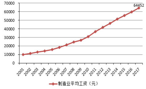 除了未來勞動(dòng)力不足之外,中國制造業(yè)員工的平均工資則呈現(xiàn)逐年增長的態(tài)勢(shì),2017年已升至64452元,同比增長8.4%。勞動(dòng)力成本不斷上升,用機(jī)器人代替人工也是更加經(jīng)濟(jì)、符合市場規(guī)律的必然選擇。目前,“世界工廠”正不斷的從中國向東南亞等其他國家和地區(qū)轉(zhuǎn)移,中國改革開放初期借助人口紅利快速發(fā)展的條件已然不復(fù)存在。解決勞動(dòng)力不足、勞動(dòng)力成本上升的主要途徑就是智能制造,即生產(chǎn)過程的自動(dòng)化、智能化產(chǎn)業(yè)升級(jí)。未來通過產(chǎn)業(yè)的轉(zhuǎn)型升級(jí)更加注重質(zhì)量和效益的提升,“機(jī)器代人”的生產(chǎn)方式將會(huì)更加普遍。