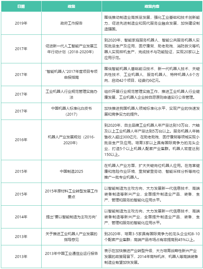 智能制造是“中國制造2025”發(fā)展規(guī)劃的重要發(fā)展方向,是未來制造業(yè)發(fā)展的必然趨勢(shì),工業(yè)機(jī)器人是智能制造的關(guān)鍵設(shè)備,行業(yè)發(fā)展?jié)摿薮?。近年來,國家出臺(tái)了一系列的政策支持和鼓勵(lì)中國工業(yè)機(jī)器人行業(yè)的發(fā)展。根據(jù)2016年國務(wù)院發(fā)布的《機(jī)器人產(chǎn)業(yè)發(fā)展規(guī)劃(2016-2020年)》,到2020年,我國工業(yè)機(jī)器人產(chǎn)量達(dá)到10萬臺(tái),六軸及以上工業(yè)機(jī)器人年產(chǎn)量達(dá)到5萬臺(tái)以上;培育3家以上具有國際競爭力的龍頭企業(yè);機(jī)器人密度達(dá)到150以上。