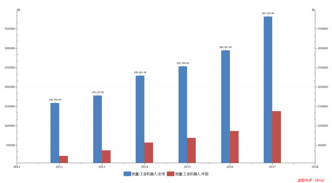中國自2013年起成為了全球工業(yè)機(jī)器人最大的市場,2017年,中國工業(yè)機(jī)器人銷量達(dá)14.1萬臺(tái),同比增長62.1%,全球工業(yè)機(jī)器人銷量為38萬臺(tái),中國占全球的比重高達(dá)37%。中國工業(yè)機(jī)器人銷量不僅總量較大,而且增速也比較快,2011-2017年銷量年均增速高達(dá)39.5%。