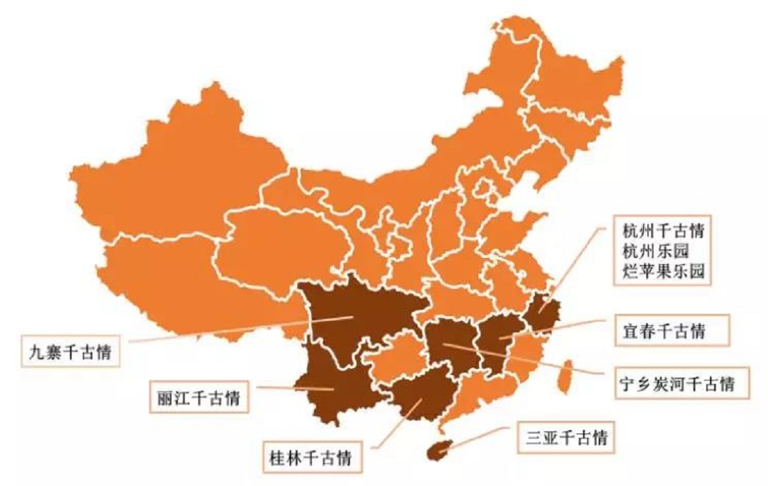 宋城演藝的主題公園主要布局在旅游發(fā)達(dá)城市和地區(qū),目前有9個主題公園,包括7個千古情景區(qū),布局城市包括一線旅游城市杭州、三亞、麗江、九寨、桂林,也在二三線旅游城市如寧鄉(xiāng)、宜春進(jìn)行輕資產(chǎn)布局。