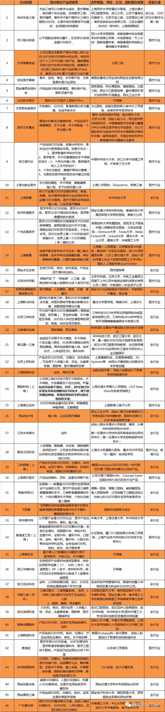 在做這個選題之前,本以為國內(nèi)的相關(guān)企業(yè)會很少,可是此次盤點動脈網(wǎng)一共找到46家與3D醫(yī)療打印相關(guān)的企業(yè)(由于時間和信息量的關(guān)系,相信我們收集的數(shù)據(jù)并不全面,未收錄到的企業(yè)和機(jī)構(gòu)請與我們聯(lián)系)。