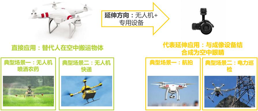 無人機(jī)價值在于替代人類完成空中作業(yè),并且能夠形成空中平臺,結(jié)合其他部件擴(kuò)展應(yīng)用。
