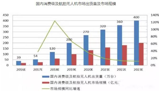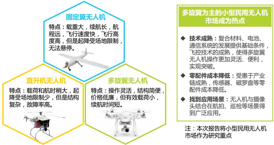 隨著技術(shù)成熟,零配件成本降低,并且開發(fā)了航拍、電力巡檢等應(yīng)用場景,以多旋翼無人機(jī)為主的小型民用無人機(jī)市場成為熱點(diǎn)。