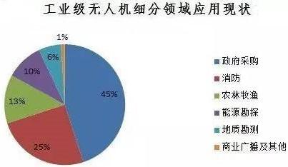 目前,工業(yè)級無人機(jī)細(xì)分領(lǐng)域中,政府采購占比45%,消防占比25%,農(nóng)林牧漁占比13%,能源勘探占比10%,地質(zhì)勘測占比6%,商業(yè)廣播及其他占比1%。