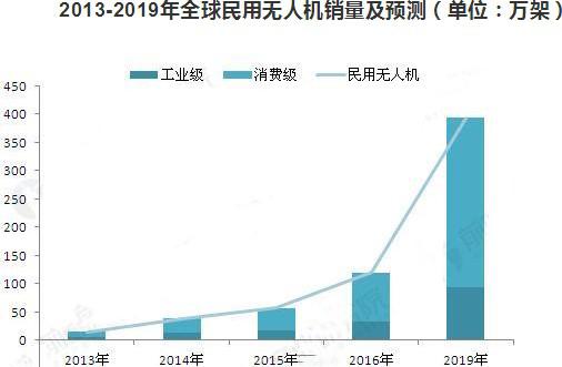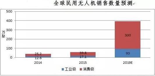 2015年,民用無人機(jī)銷量約為56.9萬架,其中,工業(yè)級無人機(jī)銷量約為17.1萬架,消費(fèi)級無人機(jī)銷量約為39.8萬架。據(jù)IDC預(yù)測,到2019年全球民用無人機(jī)銷量預(yù)計(jì)可達(dá)393萬架,其中,消費(fèi)級約為300萬架,年均復(fù)合增長率為60%,工業(yè)級約為93萬架,年均復(fù)合增長率為45%。