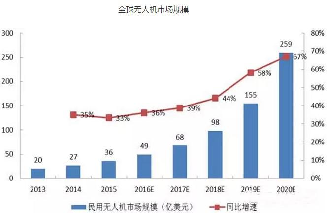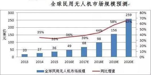 2015年,全球民用無人機(jī)市場規(guī)模為36億美元,同比增長33%。據(jù)中國產(chǎn)業(yè)信息網(wǎng)預(yù)測,到2020年全球民用無人機(jī)市場規(guī)模預(yù)計(jì)可達(dá)259億美元,年均復(fù)合增長率為42%。