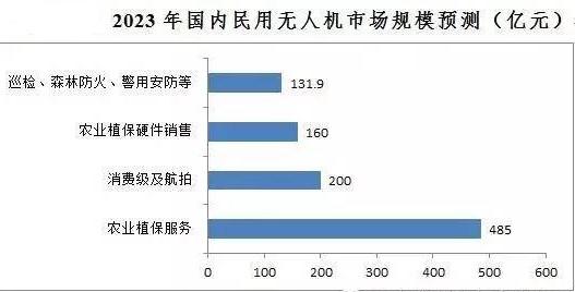預(yù)計(jì)到2023年,我國民用無人機(jī)各細(xì)分應(yīng)用領(lǐng)域的市場份額分別為:消費(fèi)級及航拍無人機(jī)市場200億元,農(nóng)業(yè)植保硬件銷售160億元,農(nóng)業(yè)植保服務(wù)485億元,巡檢、森林防火、警用安防等領(lǐng)域共計(jì)131.9億元,合計(jì)976.9億元。