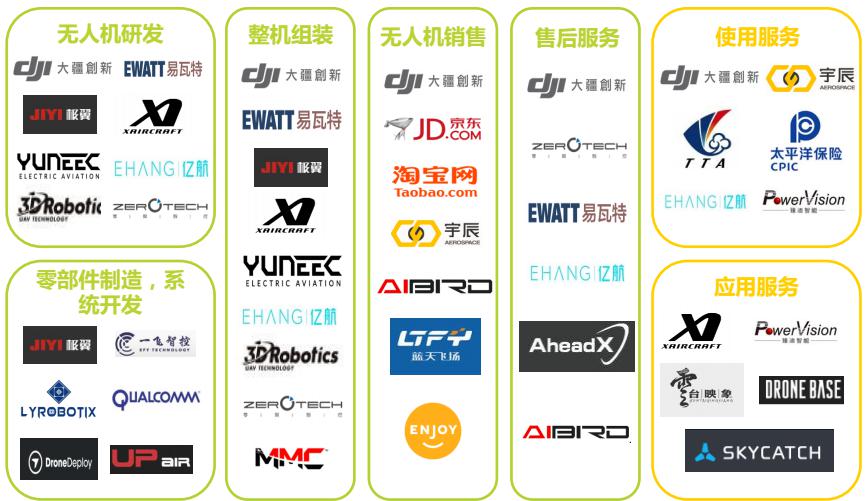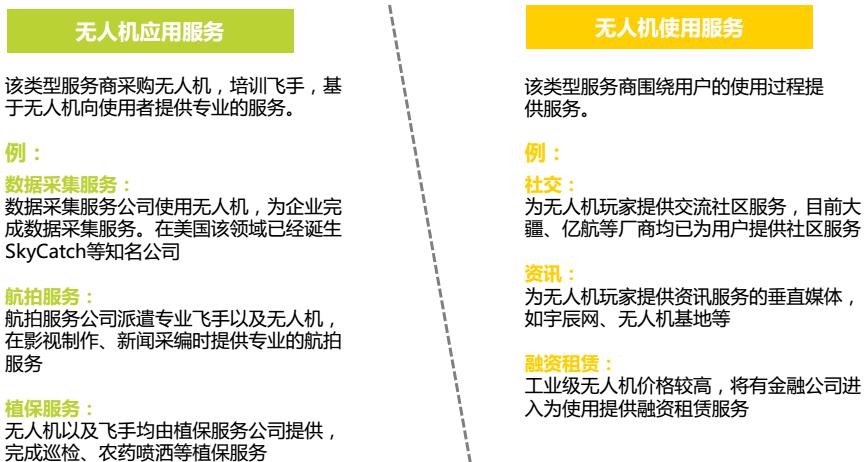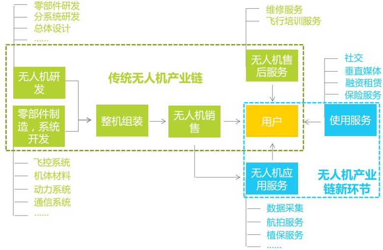 無人機(jī)產(chǎn)業(yè)鏈除了傳統(tǒng)的生產(chǎn)制造環(huán)節(jié)外,還出現(xiàn)了針對用戶使用過程的社交、保險以及數(shù)據(jù)采集、航拍等基于應(yīng)用場景的產(chǎn)業(yè)服務(wù)。
