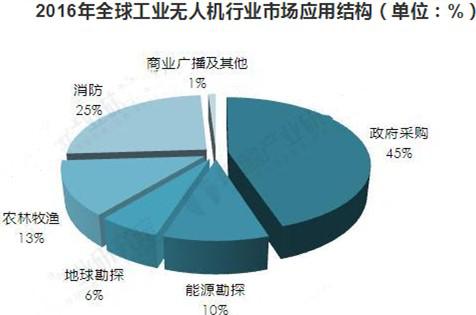 從應(yīng)用結(jié)構(gòu)來看,當(dāng)前全球工業(yè)無人機(jī)行業(yè)中45%為政府采購,能源勘探和地球勘探的應(yīng)用占比分別為10%和6%,農(nóng)林牧漁的應(yīng)用占比約為13%,在消防領(lǐng)域的應(yīng)用占比達(dá)到25%。