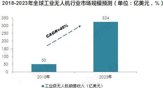 隨著工業(yè)級無人機(jī)技術(shù)的不斷發(fā)展,未來工業(yè)級無人機(jī)將呈爆發(fā)式增長。結(jié)合國際權(quán)威機(jī)構(gòu)對未來工業(yè)級無人機(jī)行業(yè)發(fā)展趨勢的判斷,預(yù)計(jì)到2023年,全球工業(yè)級無人機(jī)市場規(guī)模將超過300億美元。2018-2023年行業(yè)年均復(fù)合增長率將維持在45%左右。