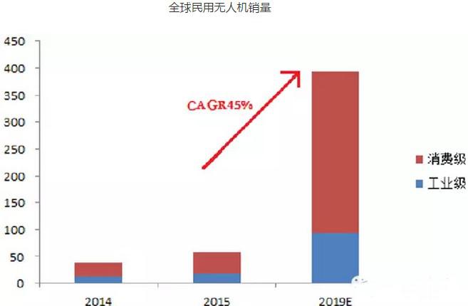全球民用無人機(jī)在2014年迎來大約37.8萬架的銷量,其中工業(yè)級無人機(jī)銷量約12.6萬架,消費(fèi)級無人機(jī)銷量約25.2萬架。在2015年大約銷售民用無人機(jī)56.9萬架,其中,工業(yè)級無人機(jī)銷量約17.1萬架,消費(fèi)級無人機(jī)銷量約39.8萬架。IDC預(yù)測,到2019年全球無人機(jī)年銷量將達(dá)到393萬架,其中消費(fèi)級300萬臺,CAGR達(dá)到60%;工業(yè)級無人機(jī)銷量為93萬臺,CAGR達(dá)到45%。
