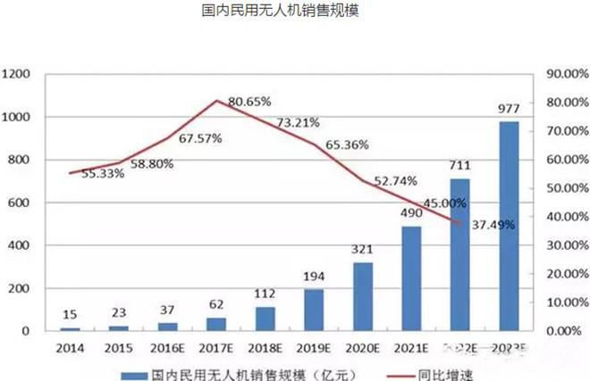 2014年國內(nèi)民用無人機(jī)產(chǎn)品銷售規(guī)模15億元,2015年銷售規(guī)模23.3億元,同比增長55.3%。據(jù)IDC數(shù)據(jù)預(yù)測,2019年中國民用無人機(jī)市場銷售規(guī)模達(dá)到390萬臺,合計(jì)約600億元。預(yù)計(jì)到2023年,國內(nèi)民用無人機(jī)市場規(guī)模將會達(dá)到976.9億元,年復(fù)合增長率59%。