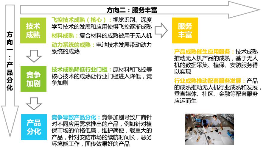 無人機(jī)技術(shù)成熟降低了行業(yè)門檻,使得行業(yè)競爭加劇,產(chǎn)品出現(xiàn)分化,技術(shù)和產(chǎn)品的成熟也使得應(yīng)用和配套服務(wù)越發(fā)豐富。