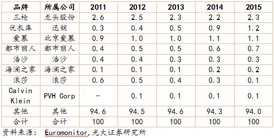 內(nèi)衣作為消費(fèi)者的第二層“肌膚”,消費(fèi)者對(duì)內(nèi)衣的消費(fèi)比其他成衣具備更強(qiáng)的忠誠(chéng)度,進(jìn)入 21 世紀(jì)后,消費(fèi)者對(duì)內(nèi)衣品牌的認(rèn)可也越來(lái)越強(qiáng)。 雖然部分品牌由于品牌老化導(dǎo)致市占率降低,但是總體看,前 16 家女士?jī)?nèi)衣品牌的市場(chǎng)份額從 2011 年的 13.9%提升到了 2015 年的 15%。前八大男士?jī)?nèi)衣品牌的市占率從 5.4%提升到 6%。