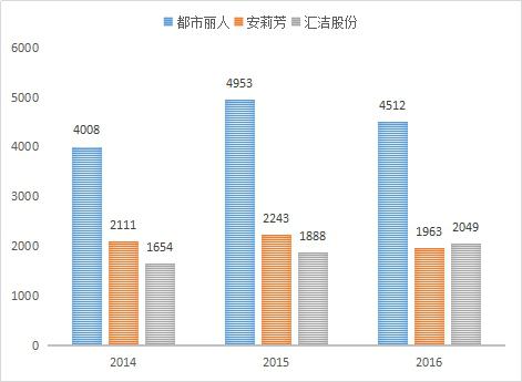 考慮到使用萊卡材料內(nèi)衣企業(yè)主要是中高端企業(yè),企業(yè)占市場(chǎng)份額較大,數(shù)據(jù)可獲取等因素,本部分主要針對(duì)中高端內(nèi)衣企業(yè)安莉芳集團(tuán)(以下簡(jiǎn)稱為:安莉芳)、深圳匯潔集團(tuán)股份有限公司(以下簡(jiǎn)稱為:匯潔股份)、大眾性企業(yè)廣東都市麗人實(shí)業(yè)有限公司(以下簡(jiǎn)稱:都市麗人)進(jìn)行分析。