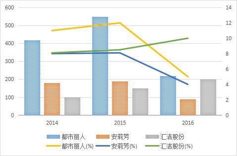 匯潔股份的增長(zhǎng)增速是在放緩的。公司2015年?duì)I收和凈利分別同比增長(zhǎng)了14.13%和24.63%,2016年這兩個(gè)數(shù)據(jù)則只有8.54%和10.77%。所以,零售環(huán)境的疲弱確實(shí)不可否認(rèn)。