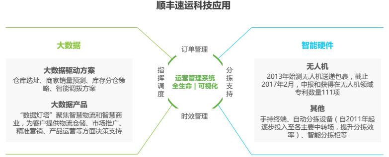 順豐速運成立于1993年,截止2016年12月,順豐控股業(yè)務(wù)覆蓋全國331個地級市、2620個縣區(qū)級城市,近13000個自營網(wǎng)點。順豐速運業(yè)務(wù)包括國際業(yè)務(wù)、同城配送、冷運、重貨(陸路&航運)等。順豐一貫重視在信息化領(lǐng)域的投入,負(fù)責(zé)集團信息系統(tǒng)研發(fā)與運維的科技人員超過2,000名,16年信息技術(shù)費投入2.6億、占營業(yè)成本0.57%,相較15年提升0.08個百分點。14-16年來,順豐控股申報和獲得的專利523項,軟件著作權(quán)200多項。未來,順豐還將繼續(xù)擴大在科技領(lǐng)域投入,不斷提高各方面的科技與智能化水平。