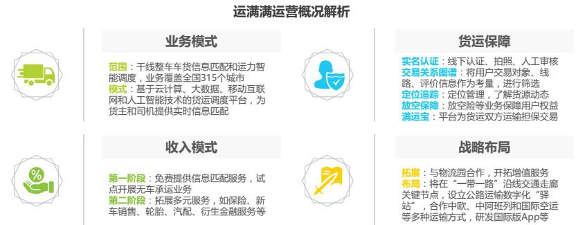 運滿滿成立于2013年,是基于云計算、大數(shù)據(jù)、移動互聯(lián)網(wǎng)和人工智能技術(shù)開發(fā)的貨運調(diào)度平臺,為貨主和司機提供實時信息匹配,減少貨運空載率、提高物流運行效率。由于模式相近,運滿滿被業(yè)界稱為“貨運版的滴滴”,成立3年來共獲得7輪融資,目前估值超過10億美金。截止2017年9月底,平臺實名注冊重卡司機400余萬、貨主100余萬,業(yè)務(wù)覆蓋全國 315 個城市。運滿滿最新推出擔(dān)保交易產(chǎn)品“滿運寶”,為貨運雙方提供運費擔(dān)保。此外,運滿滿還與阿里云、菜鳥、螞蟻金服、平安保險、中國聯(lián)通、中國重汽等開展深度戰(zhàn)略合作,通過跨界融合,不斷推出創(chuàng)新產(chǎn)品和服務(wù)。未來,運滿滿將借助人工智能、無人駕駛、區(qū)塊鏈等技術(shù)驅(qū)動,提供貫穿全產(chǎn)業(yè)鏈的線上線下服務(wù),構(gòu)建公路物流生態(tài)圈,打造綜合性的貨運平臺。