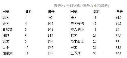 國家的物流業(yè)總體競爭力不僅取決于基礎(chǔ)設(shè)施建設(shè)水平,還取決于整個物流產(chǎn)業(yè)的管理水平、第三方物流企業(yè)發(fā)展水平和第四方物流企業(yè)的整合能力。從國家層面來看,世界銀行發(fā)布的報告顯示,在全球物流業(yè)競爭力排行榜(Logistics Performance Index)中,歐洲國家表現(xiàn)最為突出,前20名中超過60%的企業(yè)來自歐洲,亞洲物流業(yè)競爭力最強的國家/地區(qū)是日本(排名第十),其次為中國香港和臺灣地區(qū),中國大陸在全球僅排名第28??傮w而言,發(fā)展中國家在基礎(chǔ)設(shè)施、國際運輸、物流能力、交貨及時性等方面還與歐美等發(fā)達國家存在較大的差距,物流業(yè)的全球競爭能力還十分有限。