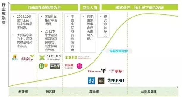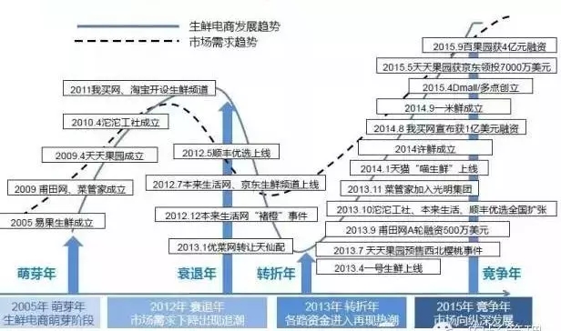 2005年,易果網(wǎng)成立,2008年,出現(xiàn)了專注做有機食品的和樂康及沱沱工社,這幾個企業(yè)都專注于小眾市場。在此期間,國內頻發(fā)食品安全事件,導致很多消費者產(chǎn)生了對高品質、高安全性食材的需求,這使得很多企業(yè)看到了生鮮這個巨大市場,在2009年-2012年之間,涌現(xiàn)了一大批生鮮電商。過多的商家進入這個行業(yè),也導致了行業(yè)泡沫的產(chǎn)生,當時的市場需求并沒有那么大,加上冷鏈物流及信息技術水平不配套,而生鮮電商的模式也是原封不動的COPY了普通電商的模式,最終導致了很多企業(yè)倒閉。