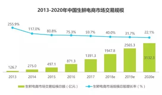2017年中國生鮮電商市場交易規(guī)模約為1391.3億元,同比增長59.7%,預計2020年,生鮮電商交易規(guī)??梢赃_到3132億元。一方面基于消 費者消費習慣養(yǎng)成,另一方面基于冷鏈和倉儲系統(tǒng)迅速完善。