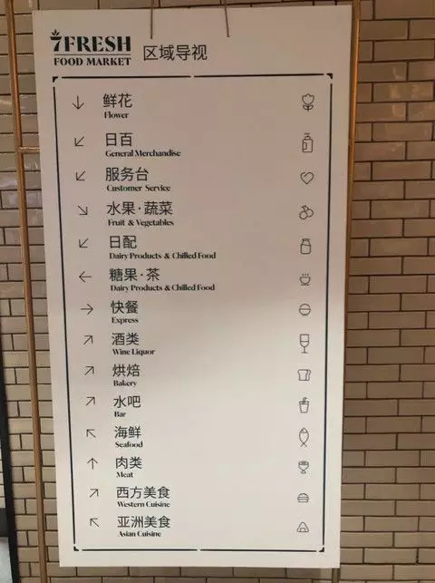 如上圖所示,不同于盒馬鮮生面積小、以海鮮為主的特點,7fresh總面積超過4000平米,涉及品類廣泛,包括鮮花、日百、快餐、烘焙、海鮮、肉類等。