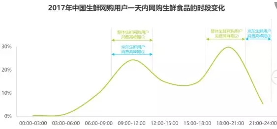 從消費時間來看,生鮮網(wǎng)購用戶購物的活躍曲線在09:00-12:00和18:00-21:00出現(xiàn)波峰,這兩個時間段分別對應午餐前和晚餐前的使用時段,用戶可能選擇這兩個時間段網(wǎng)購午餐和晚餐所需要的食材。京東生鮮用戶消費的第一段高峰期和整體用戶基本一致,第二段高峰期時間為晚間21:00-22:00,相對靠后。艾瑞分析認為,京東生鮮B2C模式目前主要為次日達,用戶在平臺購買即時性晚餐食材的需求較小。