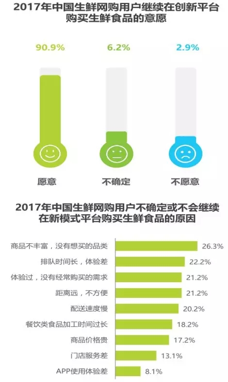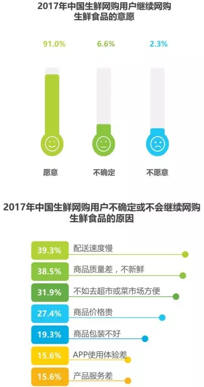 九成以上用戶愿意繼續(xù)網(wǎng)購生鮮食品,配送速度慢和品質問題是用戶不確定或不會繼續(xù)購買的主因。