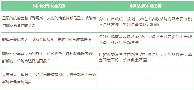 在銀川本地,主城范圍內除最早建立的北環(huán)批發(fā)市場外,再沒有專業(yè)的大型生鮮批發(fā)市場,近幾年發(fā)展起來的有:四季鮮果蔬批發(fā)市場、21世紀冷鏈批發(fā)市場、海吉星農(nóng)副產(chǎn)品物流園、潤恒農(nóng)產(chǎn)品市場等都在郊區(qū)。大型農(nóng)產(chǎn)品交易市場是傳統(tǒng)生鮮流通中不可缺少的一環(huán),是各社區(qū)農(nóng)貿市場及超市生鮮尤其是蔬菜水果的主要來源,具有成交量大、知名度高、社會影響大、流通體系健全、配套完整等優(yōu)勢,但也存在傳統(tǒng)生鮮流通方式的不足。