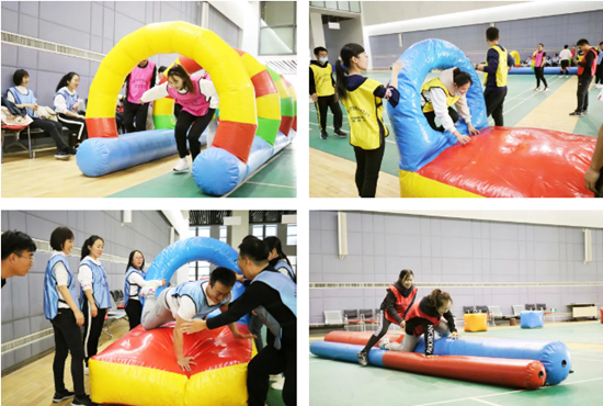 “螃蟹過河”挑戰(zhàn)團隊協(xié)作與配合。每四人組成一只可愛的“螃蟹”,在最短的時間內(nèi)往返通過獨木橋的隊伍即獲得勝利。螃蟹服形態(tài)臃腫,褲腿相連,給隊員們增添了不少比賽難度,參賽隊員們在極短的時間內(nèi)商量戰(zhàn)術,迅速統(tǒng)一思想,賽場上他們口號整齊,步伐一致,為了完成同一個目標而齊心協(xié)力、共同努力,在日常工作中積累的信任與默契展露無遺。